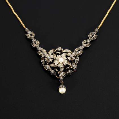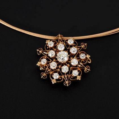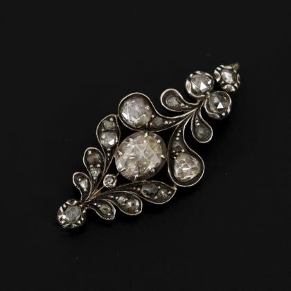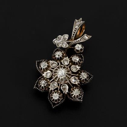 Blütenförmige Anhängerbrosche mit 8 Altschliff-Brillanten und Diamanten im Rosenschliff, wohl im späteren 19./frühen 20. Jahrhundert historisierend gefertigt. Rückwärtig kann die Öse ausgehakt sowie die gesamte Broschierung durch das Lösen einer Schraube abgenommen werden