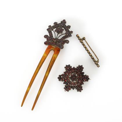 Bestehend aus Steckkamm, sternförmiger Brosche und kleiner Stabbrosche. Die sternförmige Brosche ca. 1870er/1880er Jahre mit einfachem Hakenverschluss, der Steckkamm ca. 1890er/1900er, dazu deutlich jüngere kleine Stabbrosche mit Kugelhakenverschluss