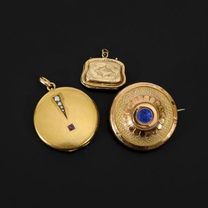 Ein rundes Medaillon mit 3 Saatperlchen und rosafarbenem Stein, ein kleines, handtaschenförmiges Medaillon sowie eine etwas ältere Rundbrosche mit blauem Schmuckstein