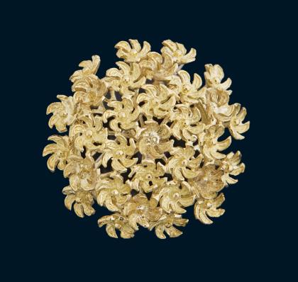 Historische Brosche en tremblant, zu deutsch "zitternd" gearbeitet. Die Mittelblüte ist an einer Feder befestigt, sodass sie bei Bewegung mitschwingt, der Besatz bestehend aus 101 Brillanten