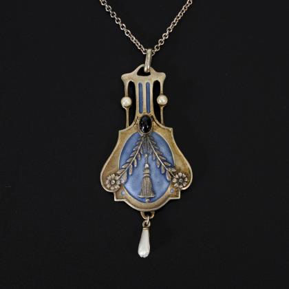 Seltener, wohl französischer, blau emaillierter Jugendstil-Anhänger, besetzt mit 2 Perlen und einem Onyx-Cabochon sowie einer tropfenförmigen Perle als Abhängung an einer Silberkette