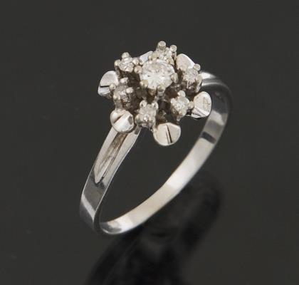 Daisy-Ring mit silbergefassten Altschliff-Brillanten zwischen zarter Schiene.