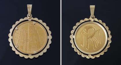 Gedenkmedaille, rückseitig graviertes Monogramm. Fassung mit beweglicher Öse. Punzen: Medaille und Fassung mit Feingehalt, Fassung mit Juweliermarke Tendor (Pforzheim)