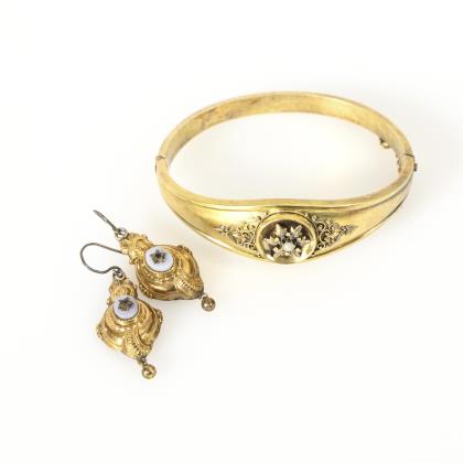 Armreif und Ohrringe aus der 2. Hälfte des 19. Jahrhunderts, wohl um 1870. Der Armreif mit Sicherheitskettchen, die Haken der Ohrhänger aus Metall