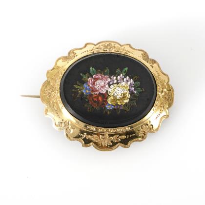 Medaillon-Anhänger mit Porzellanbildnis einer jungen Frau, dazu eine Vintage Anhänger-Brosche mit Gemme.