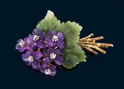 Blätter und Blüten aus Nephrit und Amethyst, Blütenstempel mit 6 kleinen Diamanten in Krappenfassung, Punzen: Feingehalt, Juweliermarke Caprice