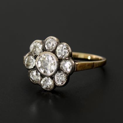 Historischer Ring mit blütenförmig angeordneten, in Silber zargengefassten Altschliff-Brillanten zwischen einer zarten Gelbgold-Schiene