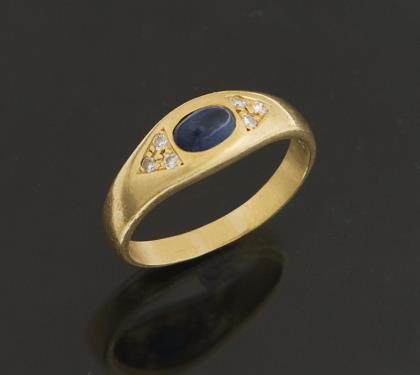 Ovaler Saphir-Cabochon, seitlich 6 kleine Diamanten. Zeitloses Design, stabile glatte Schiene. Punzen: Feingehalt, Juweliermarke RK