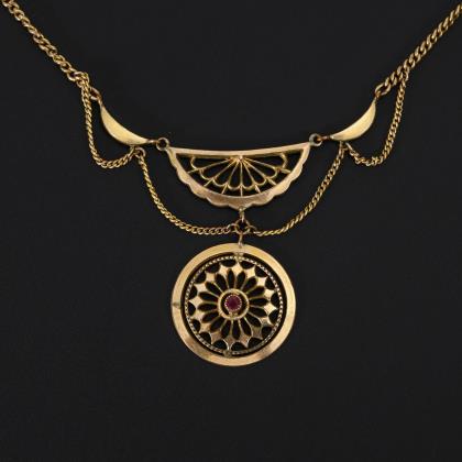 Zeittypisches Collier mit Kettenabhängungen und rundem Anhängerelement, besetzt mit einem kleinen, roten Schmuckstein, wohl Glas, an originaler Kette