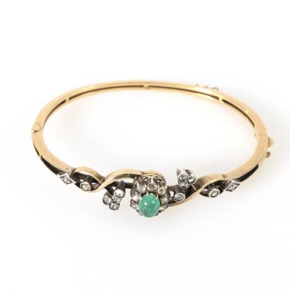 Historischer Armreif mit grünem Farbstein und Diamanten.