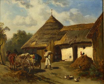VENNE, Adolf van der ((1828 Wien - 1911 Schweinfurt). Bauernhof mit Fuhrwerk.