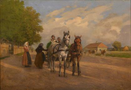 Bauern auf einem Pferdekarren im Gespräch mit zwei Frauen am Straßenrand bei tief stehender Sonne am Abend