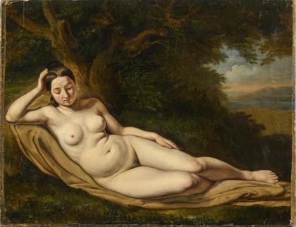 Im altmeisterlichen Stil unter einem Baum im hellen Licht lagernde nackte, junge Frau in weiter bergiger Landschaft