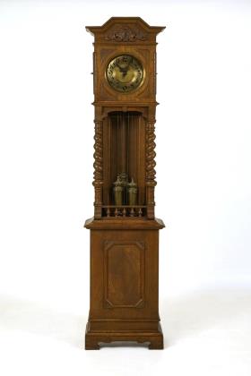 Profiliertes Gehäuse mit getrepptem Giebel und beschnitzter Wappenzier mit ligiertem Monogramm, freischwingendes Pendel in offenem Pendelkasten mit gedrehten Säulen und kleiner Balustrade, hoher Sockelbereich mit Kassettenschmuck