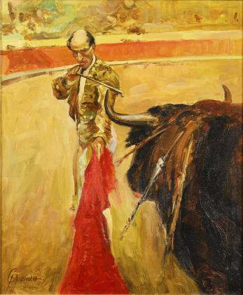 Stierkämpfer mit Degen und rotem Tuch von Angesicht zu Angesicht mit dem verwundeten Tier