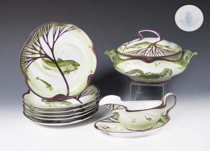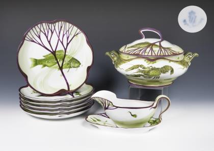 Modell-Jahr: 1899-1902, Dekor-Nr. 624. Bemalung in Chromgrün und Violett, gold staffiert. 8 Teile: 1 Kartoffelnapf, 1 Sauciere, 6 Essteller mit 5 verschiedenen Fischmotiven. Napf und Sauciere mit blauen Bodenmarken und Malermarken, Teller mit Pressmarken: Raute mit Stern, Malermarken