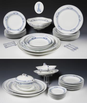 Form-Modell von 1901, Dekor von Theodor Grust 1907. Kobaltblaue Unterglasurbemalung, geometrisches Dekor aus dem sogenannten "Bügelservice". Form "T-glatt", 32 Teile: 6 Essteller, 6 Suppenteller, 6 kleine Dessertteller, 6 Dessertschalen, 4er Satz runde Schalen, 1 Deckelsauciere, 2 ovale Schalen, 1 Speiseplatte. Schwertermarken zweimal gestrichen
