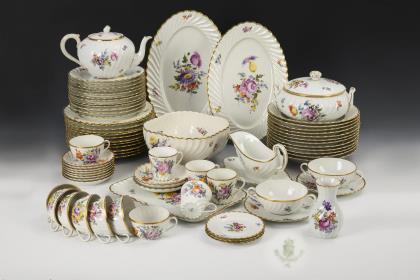 25 Teile. Form "Neuer Ausschnitt", Dekor-Nr. 111120. Farbige Blumenbemalung mit schräggestelltem Bukett und Einzelblüten, kobaltblauer Rand mit goldener "A-Kante", Goldstaffage. 6 Essteller, 4 Suppenteller, 4 große Dessertteller, 4 kleine Dessertteller, 1 Sauciere, 1 ovale Schale, 1 Terrine, 1 ovale Platte, 2 quadratische Schüsseln, 1 große runde Platte