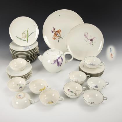 133 Teile. Form "Altozier" mit indianischem Blumendekor. 24 Speiseteller, 12 Suppenteller, 24 Salat- und Dessertteller, 2 Ovalplatten (L je 40,5 cm), 1 Gemüseteller (Ø 35 cm), 2 Blattschalen (L 24,5 cm), 1 Schale (Ø 24,5 cm), 1 Quadratschüssel (27 x 25,5 cm), 1 Sauciere mit Löffel, 1 Deckelschüssel (Ø 28 cm), 1 Terrine (L 37 cm), 1 Cabaret (L 33,5 cm), 1 Teekanne, 1 Krug (H 16 cm), 12 Teetassen mit 12 Untertassen, 12 Mokkatassen mit 12 Untertassen, 1 Zuckerdose, 1 Milchkännchen, 1 Sahnekännchen, 1 Tortenplatte, 1 Tablett (L 36 cm), 1 Kredenzteller (Ø 32 m), 4 Eierbecher und 1 Nussschälchen