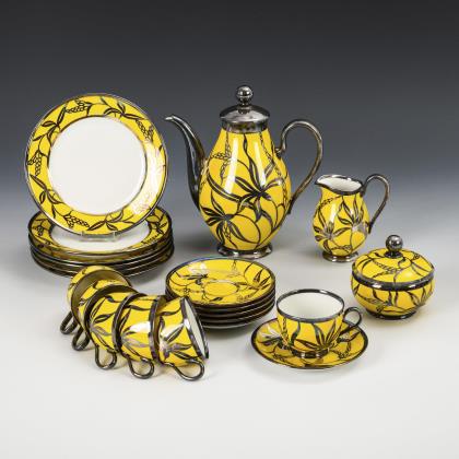 21 Teile. Empire-Form, teils mit Schwanenhenkeln. Kaffeekanne, Milchkännchen, Zuckerdose, 6 gefußte Kratertassen mit Schwanenhenkeln, 6 Untertassen und 6 Kuchenteller