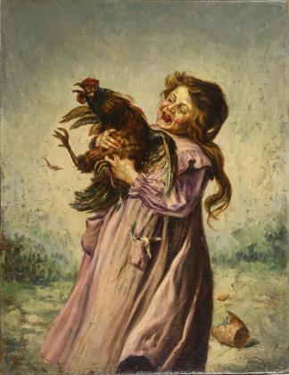 Mädchen im Kampf mit einem Hahn auf dem Hof neben einem zerbrochenen Topf