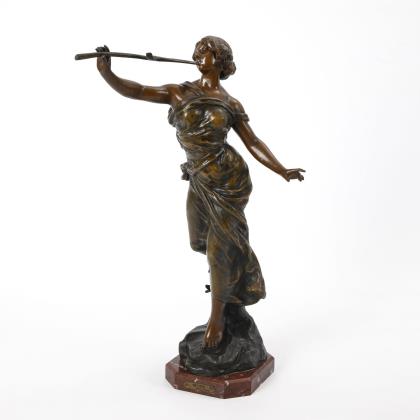 Gleichsam schwebend schreitende Schönheit im wehenden Gewand, die in eleganter Pose eine Fanfare bläst