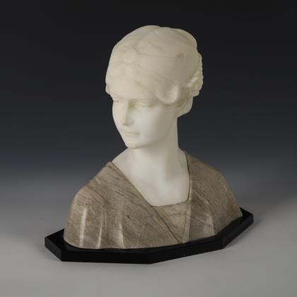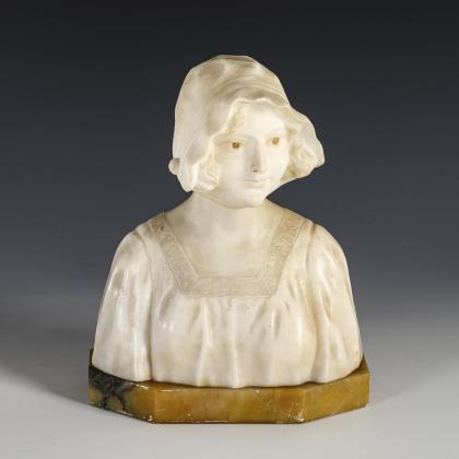 SOLAINI. Alabaster-Jugendstilfigur: Mädchen mit Blumen.