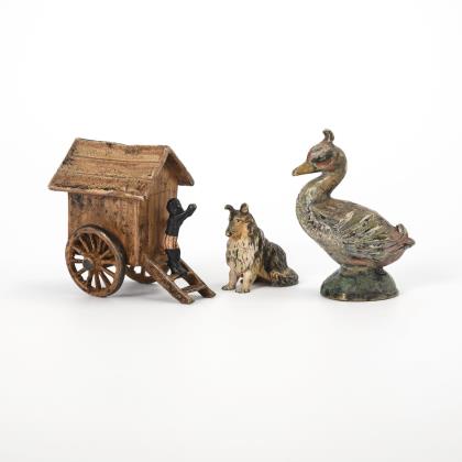 3 Wiener Bronzen: Badewagen, Ente und Hund.