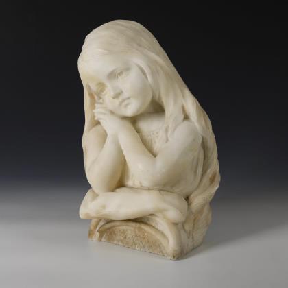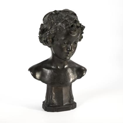 Lebensgroße Büste des versonnen blickenden Knaben mit stark lockigem Haar und leichter Kopfdrehung nach rechts. Beeindruckend ist die psychologische Erfassung des zarten Seelenzustandes