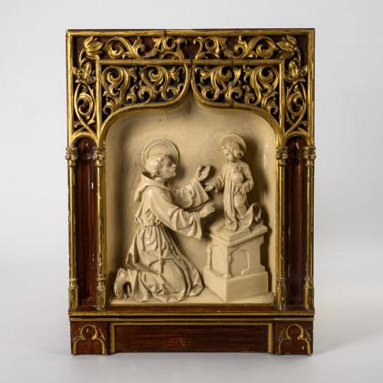 Relief-Andachtstafel: Die Vision des Heiligen Antonius von Padua im Prachtrahmen der Neogotik.