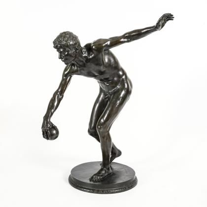 Akt eines athletischen jungen Mannes, der mit ausgreifender Geste bei voller Konzentration im Begriff ist, den Ball abzuwerfen. Thematisch erinnert dieser Moment an den berühmten Diskobolos des Myron aus der Antike