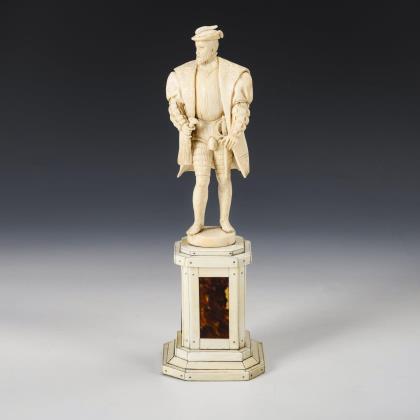 Elfenbeinstatuette: Kaiser Karl V. auf einem Postament.