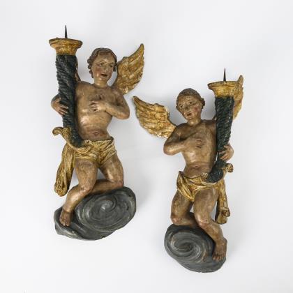 Spiegelbildlich gearbeitete, halb auf den Wolken kniende Engel mit füllhornartigen Kerzenhaltern in einer Hand, während die andere ergriffen an die Brust fasst