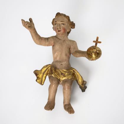 Das auf Untersicht gearbeitete, sitzende Jesuskind mit bewegtem Hüfttuch hält die Sphaira in der linken Hand und weist mit seiner rechten gen Himmel