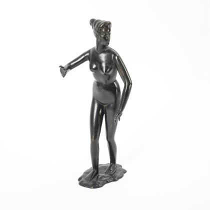 Mit etwas gelängten Proportionen gestaltete nackte Frau, die in raumgreifender Geste gehend zur Seite blickt