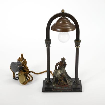 Nackt im Kontrapost stehender Ephebe mit Taenia im Haar, der an die Herme mit Athenenbüste gelehnt eine Schriftrolle in der Rechten hält. Auf dem Bronzesockel sind Musikinstrumente, eine Fackel, Lorbeer und Theatermasken reliefiert