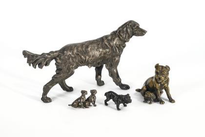 Großer Metallguss-Setter in Zinkgrau. / Bronze-Bulldogge mit Jungtier. / Paar versilberte Windhunde aus Kupfer. / Geschwärzte Bronze-Bulldogge