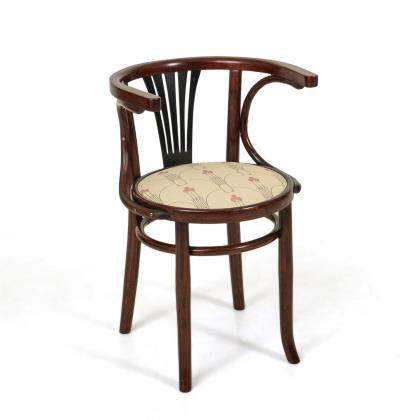 Bugholzstuhl mit gerundeter Rückenlehne und geradem Rückenlehnbrett, runde Polstersitzfläche mit hellem, farbig gemustertem Stoff nach einem Entwurf der Wiener Werkstätten, auf 4 konkaven Beinen mit Ringverstrebung