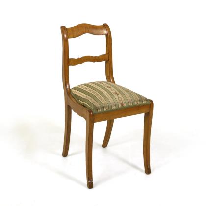 Schaufellehne mit seitlichen Endvoluten und Blattzier, durchbrochen beschnitztes Lehnbrett mit bekröntem Adler, gerade Armstützen mit Kehlungen. Breite, trapezförmige Polstersitzfläche mit grünem Jacquard-Streifenstoff, auf 4 gebogten Spitzbeinen