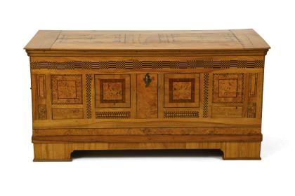 Biedermeier-Kastentruhe, leicht vorkragender Scharnierdeckel mit gestufter Gesimskante, profilierte Sockelzone mit bogenförmiger Aussparung, seitliche Eisen-Tragegriffe, schildförmiger Schlüsselbeschlag aus Messing. Umlaufend Scheinkassettierung, Deckplatte mit Sternintarsien, frontseitig mehrfach segmentierte Felder, teils mit Vögeln, bekrönten Löwen, Blumen, Dekorbändern und verschiedenen Ornamenten. Innen eine seitliche Beilade