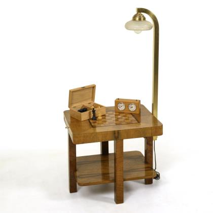 Niedriger, annähernd quadratischer Tisch mit gerundeten Ecken, Deckplatte mit Schachbrettintarsien, seitliche, mittig vertiefte Auszugsplatte mit losem Messingknauf (Platte etwas verklemmt), Zwischenablage, 4 gerade Vierkantbeine. Seitlich montiertes Messing-Vierkantrohr mit blütenförmigem Glasschirm, Glühbirne mit Drehgewinde, neu elektrifiziert, Lampe funktioniert. Dazu eine Kiste aus Buchenholz mit einem vollständigen Set aus gedrechselten Schachfiguren und eine Alpha-Schachuhr mit Stoppfunktion, läuft