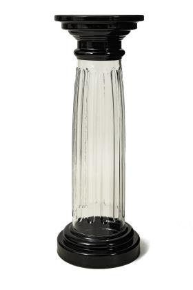 Gerader Korpus, Rückenlehne mit breitem Dreiecksgiebel und gerundeten Ecken, flach gepolsterte Seitenwände mit gerundeten Armstützen und frontseitig schwarzen Vollsäulen mit Messing, auf 4 Postamentfüßen. Heller, gestreifter Stoffbezug
