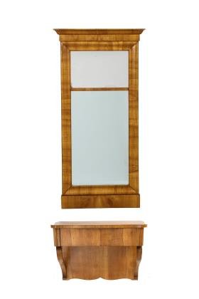 Hochrechteckiger, gekehlter Spiegelrahmen mit vorkragendem Gebälk und zweigeteiltem Spiegelfeld. 1-schübige Konsole mit geschweifter Deckplatte und Wandbrett, auf 2 volutierten Stützen