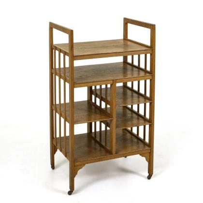 Verstrebtes Gestell mit Ablagefläche und 6 größendifferenten Fächern, seitliche Vertikalversprossung, geschweift geschnittene Zwickel im Sockelbereich, auf 4 Rollenfüßen