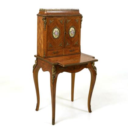4-schübiger Schreibschrank mit kassettierter Schreibklappe und teilgeschwungener Front, gestufter Giebel mit zusätzlichem Geheimschub, gedrehte Drechselsäulen an den Ecken, auf 4 Klotzfüßen. Eingericht mit 1-türigem Mittelfach als Säulentorbogen mit 2 Scheintüren, flankiert von jeweils 3 seitlichen Schüben, 1 Kopfschub und 1 Sockelschub mit Treppe zum Mittelfach, verziert mit konturierenden Fadeneinlagen. Beinknäufe und schildförmige Schlüssellochbeschläge aus Messing