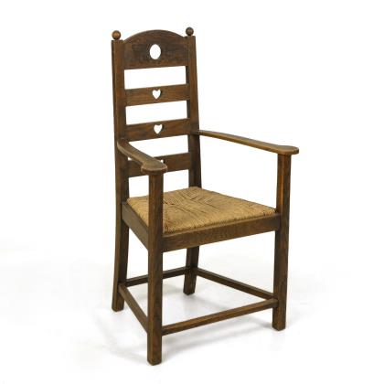 Hohe gesprosste Rückenlehne mit kerbgeschnitztem Taubendekor, ausgeschnittenen Herzen und bekrönenden Kugelknäufen, breite, geschwungene Armstützen, trapezförmiges Sitzgestell mit Sitzauflage aus Binsengeflecht und 4 verstrebten Beinen