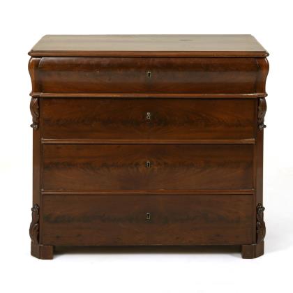 Korpus mit profilierter Deckplatte und 4 größendifferenten Schüben, geschwungener Kopfschub und abgeschrägte Ecken mit geschnitzter Blattzier, auf 4 Klotzfüßen. Schlüssellocheinlage aus Messing