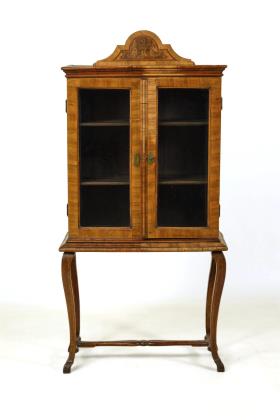 2-türiger, alt verglaster Vitrinenaufsatz mit bogensegmentiertem Giebel und Kranzgesims, auf passend ergänztem Gestell mit 4 s-förmig geschwungenen Beinen und geschwungener Querverstrebung. Konturierende Band- und Fadeneinlagen. Innen 3 Fächer. Schildförmige Schlüssellochbeschläge aus Messing