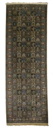 Regelmäßig gegliedertes Mittelfeld aus alternierenden Feldern mit verschiedenen Bäumen, Nischendekor, Botehs und Ornamenten. Umlaufende Bordüre mit stilisierten Palmetten, Rosetten und Dekorbändern. Teilgeflochtene Fransenabschlüsse