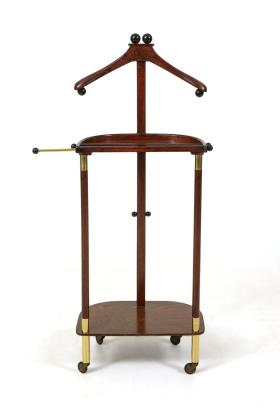 Jüngerer Nachbau des praktischen Kleiderständers mit Kleiderbügel, 2 Ablageflächen, einer Querstrebe mit einem herausziehbaren Messingstab, verziert mit Kugelknäufen und Messing, 4 Rollfüßen